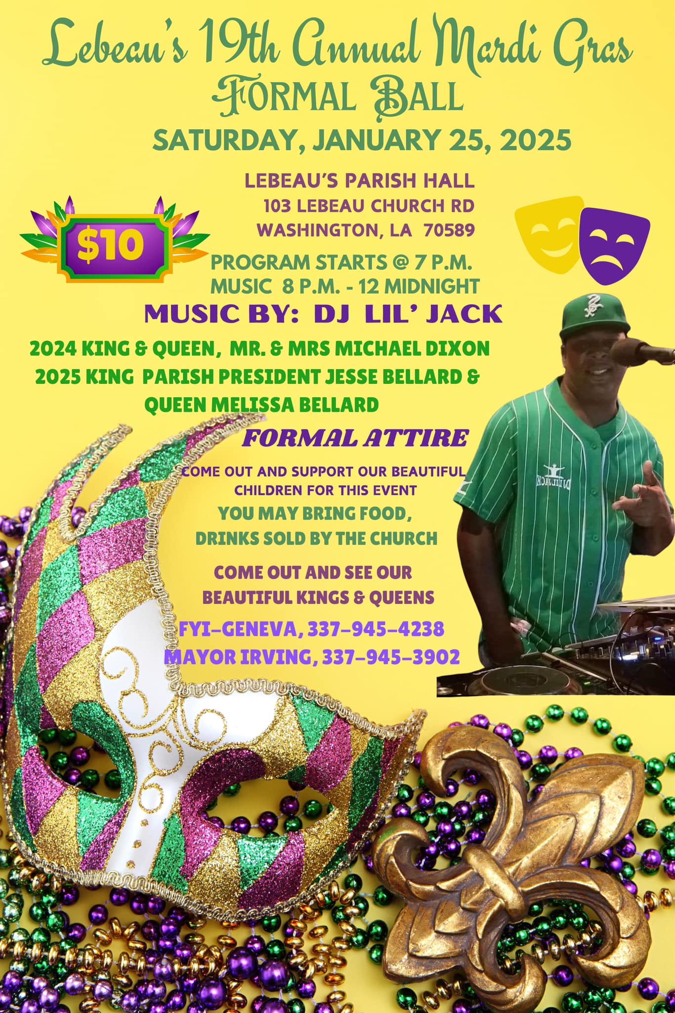 Lebeau’s 20th Annual Mardi Gras Formal Ball will take place on January 24th at the Lebeau Parish Hall. Program starts at 6pm with music by DJ Lil’ Jack from 8pm-12pm.