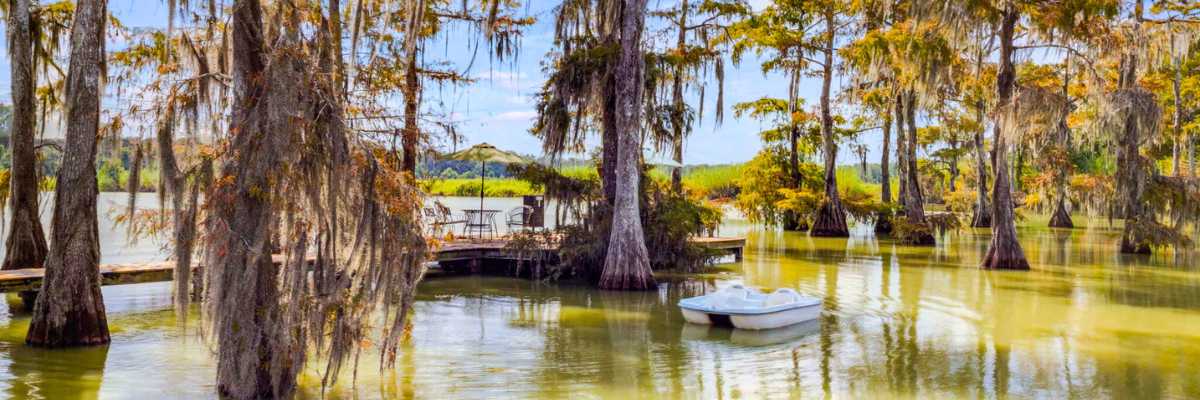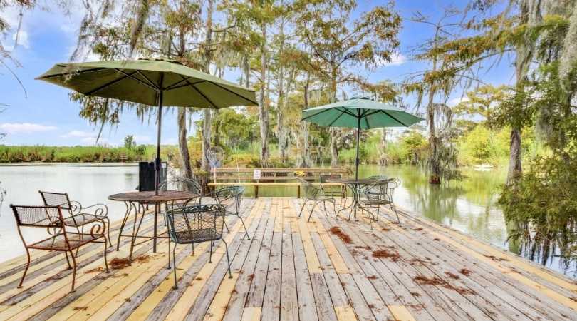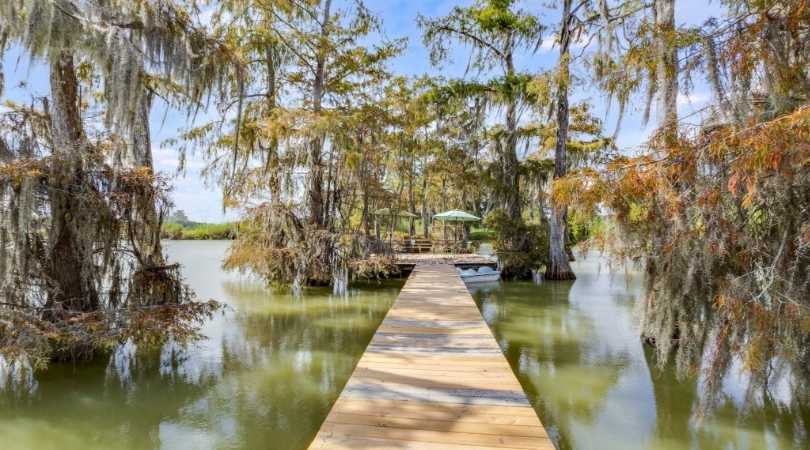 Bayou Oaks is a stunning vacation rental located between the City of Opelousas, Louisiana, known as the Zydeco Capital of the World, and Leonville, a small town located right on the Bayou Teche. The rental sits on a 10-acre private lake that includes kayaks, pedal boats as well as fishing poles. The spacious house can sleep 12 with two bedrooms and pull-out beds in the living room. There's plenty to do inside with a foosball table, smart TV, Wi-Fi, and fully stocked kitchen. When you're ready to disconnect, there's a screened-in porch, where you can relax and enjoy the gorgeous waterfront view. With a walkway leading over the water and between moss-strewn cypress trees, the floating seating area is perfect for entertaining and hosting parties.
